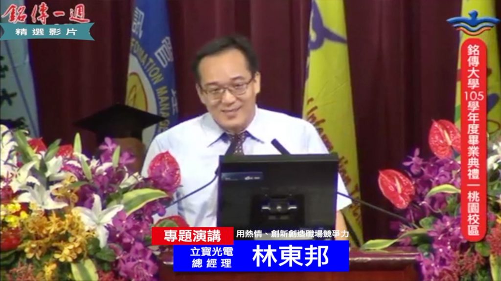 影音專區校友動態 【銘傳一週精選影片】林東邦校友畢典分享:用熱情、創新創造職場競爭力 2017-06-19 編輯|許棠詠 https://www.facebook.com/MCUWeekly/videos/840071949492048/ 立寶光電總經理兼任勤立生物科技營運長林東邦,銘傳首屆招收的男學生,統資系第一屆校友;在今年桃園畢業典禮上以「用熱情、創新創造職場競爭力」為主題,勉勵畢業生微笑面對壓力、冷靜面對挫折,正確道德觀及謙卑的心接受挑戰,未來一定會有成功機會。