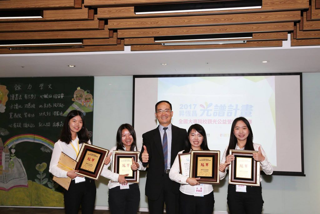【本刊訊】為提升台灣偏鄉學子對觀光業的興趣,昇恆昌免稅商店和其成立的江許笋文教基金會共同主辦第二屆「昇恆昌光譜計畫-2017全國大專院校觀光公益營提案競賽」,觀光系助理教授黃永全指導的「銘傳大學旅遊創新實驗社」,觀光四甲鄭瑾瑜、溫佳琪、陳育盈、蘇郁淳等4位學生,奪得冠軍,獎金10萬元!8/1-4將為桃園市大溪區仁和國中60位學生舉行觀光營。