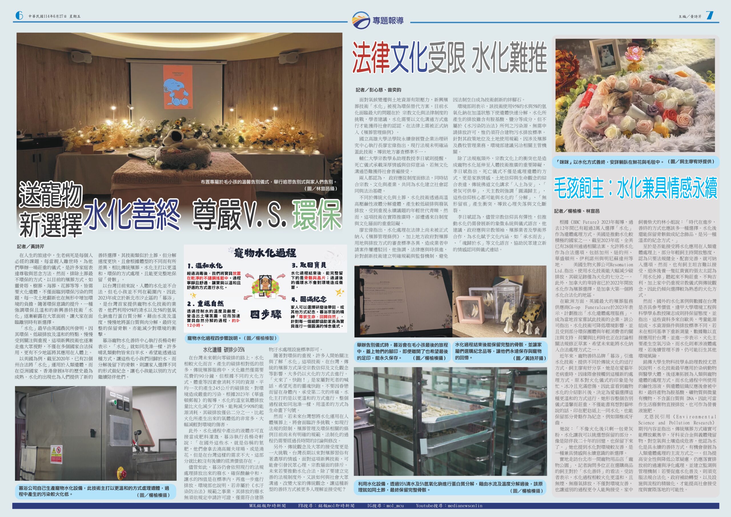 「水化善終新選擇」生老病死是人生中必經的歷程。除了傳統的土葬、火化與樹葬,隨著環保意識抬頭,「水化」這項新興技術也逐漸走入大眾視野。水化利用清水與氫氧化鈉分解遺體中的蛋白質,最終保留完整骨骸,能大幅降低對環境的影響。目前台灣將此技術應用於寵物善終服務,而在國外,已有成功運用於人體的案例。然而,受限於現行法規及文化觀念,台灣尚未開放將水化技術運用於人體。