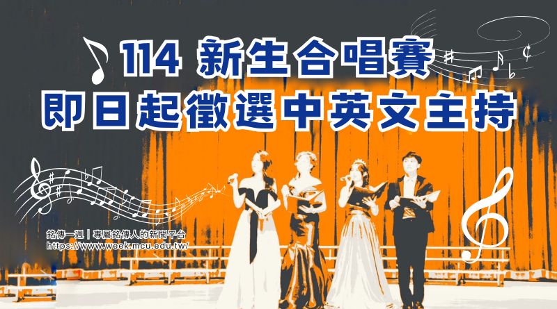 本屆新生盃合唱比賽決賽訂於12/5(五)14:20至21:30,在體育一館一樓羽球場舉行。作為校園年度盛事,主持人將肩負串聯舞台、帶動氛圍的角色,與參賽隊伍共同呈現青春最動人的篇章。主辦單位誠摯邀請同學踴躍參與徵選,讓「響耀」成為今年最亮眼的校園記憶。更多活動詳情,請洽Instagram粉絲專頁【mcu_chorus】。