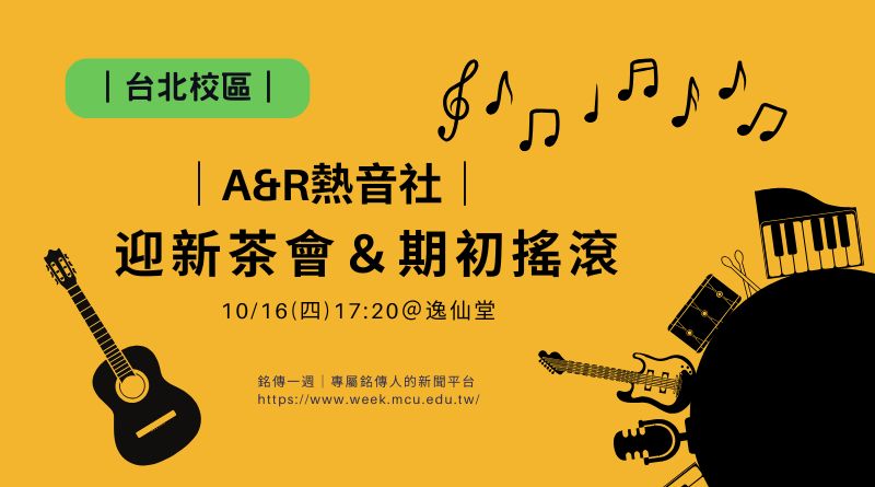 想要用最熱情的節奏點燃大學生活嗎?台北校區A&R熱音社將於10/16(四)在逸仙堂舉辦「新生茶會暨期初搖滾」活動,邀請所有對音樂懷抱熱忱的同學們共襄盛舉。活動將在17:20開放進場,為渴望在音樂中找到歸屬感的大一新鮮人,打造一場充滿活力與交流的盛會。