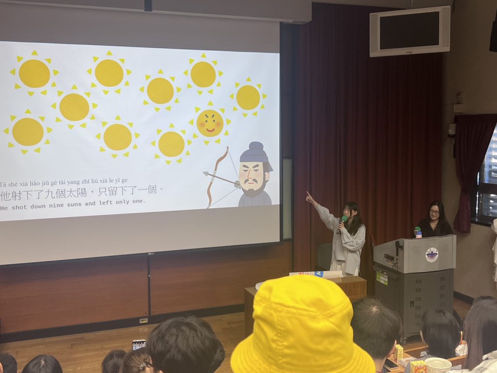 Ms. Judy, a Mandarin teacher, together with Ms. Cindy from the OISS Office as translator, brought the legend to life through an engaging bilingual storytelling session. Ms. Judy began in Chinese: “很久很久以前,天空有十個太陽。” Ms. Cindy quickly translated into English: “A long time ago, there were ten suns in the sky.”