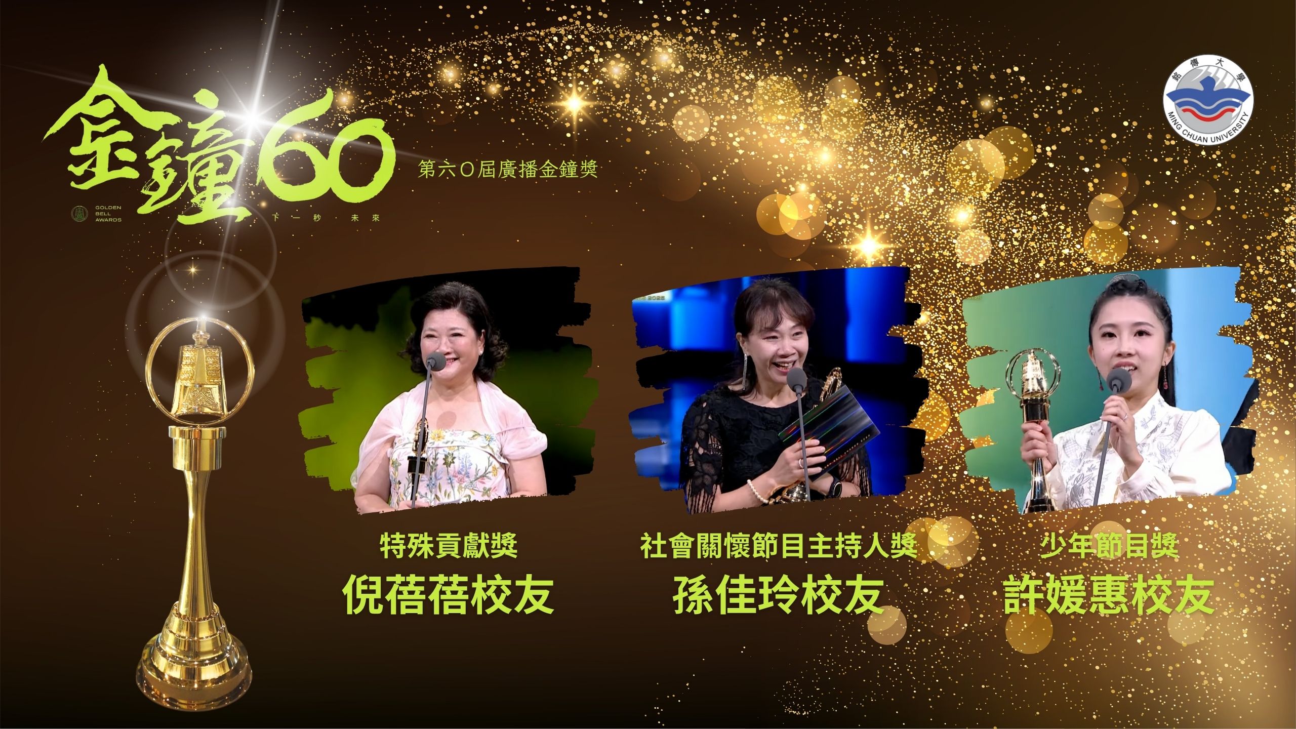 【本刊訊】「第60屆廣播金鐘獎」10/11在台北流行音樂中心盛大舉行頒獎典禮,銘傳校友敲響金鐘!商專商文科校友倪蓓蓓獲頒廣播界最高榮耀「特殊貢獻獎」、國發所校友孫佳玲獲得「社會關懷節目主持人獎」、廣電系校友許媛惠獲得「少年節目獎」,用聲音在空中陪伴各世代的聽眾。