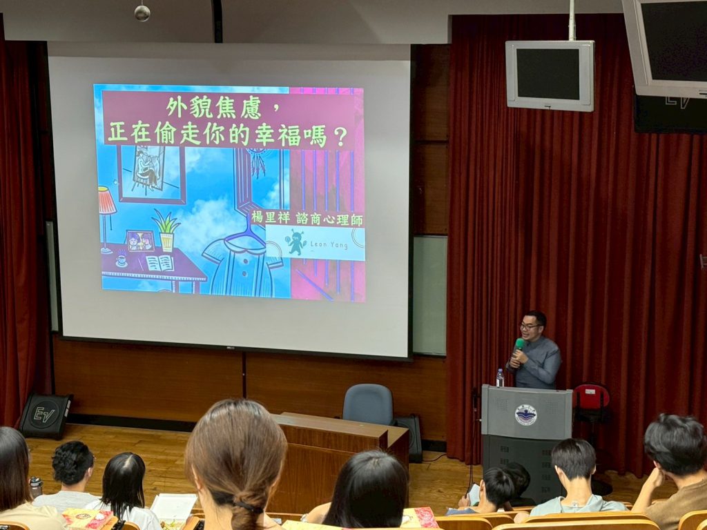 楊心理師沒有否定人們對容貌的追求,而是帶領同學進一步思考,怎樣警覺自己深受影響以致陷入心理健康危機?他引用心理學研究對於容貌焦慮的具體定義:「因擔心自己外 表不符大眾審美標準,而產生負面情緒與行為改變」,並提供「社會容貌焦慮量表」協助學生自我評測。他提到,容貌焦慮與社群媒體的大量使用有高度關聯性,心理後果包括:憂鬱、焦慮、社交退縮、關係不安全感、更多身體檢查、避免活動、考慮並非必要的醫美或過度修圖,甚至研究也指出負面身體形象與自殺意念、自殘顯著相關等。