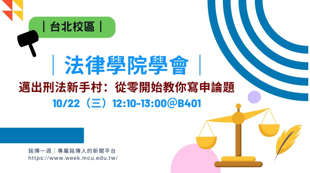凡於10/19(日)前完成報名的同學,當天不僅可享用免費午餐,還有機會抽中張鏡榮老師的暢銷著作。法律學院學會誠摯邀請有志成為法律人的同學踴躍報名參加,讓「刑法新手村」成為學習之路的完美起點。更多活動資訊請洽Instagram【mcu_law】。報名表單連結如下:https://docs.google.com/forms/d/1oVvMs_HE2XWRwsgSAbVHNK6O2BbrWXcmDj2l3PACMJw/viewform
