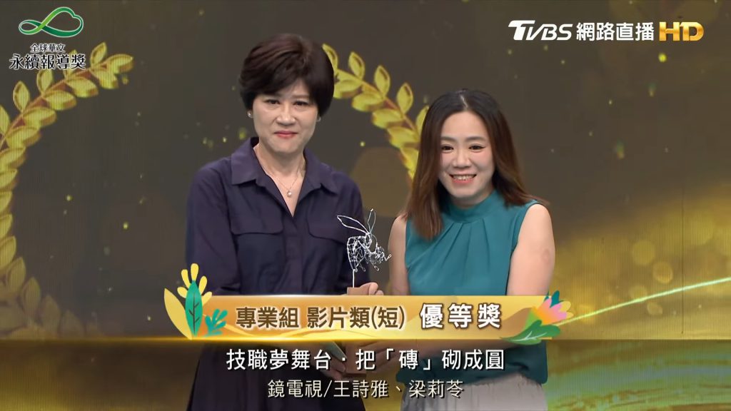 另,由王詩雅校友與鏡電視團隊製作的《技職夢舞台.把「磚」砌成圓》亦獲得專業組影片(短)優等獎。團隊前進砌磚築牆的案場,記錄世界冠軍工作實境。文字敘事簡潔流暢,畫面語言豐富飽滿,光影色調與線條構圖之用心,構建出兼有好看與深度的作品,捕捉到砌磚國手們的自信,在鏡頭前自在又從容地互動,並善用受訪者的談笑聲與現場音為報導增色,呈現出台式職人4.0的未來新樣貌。