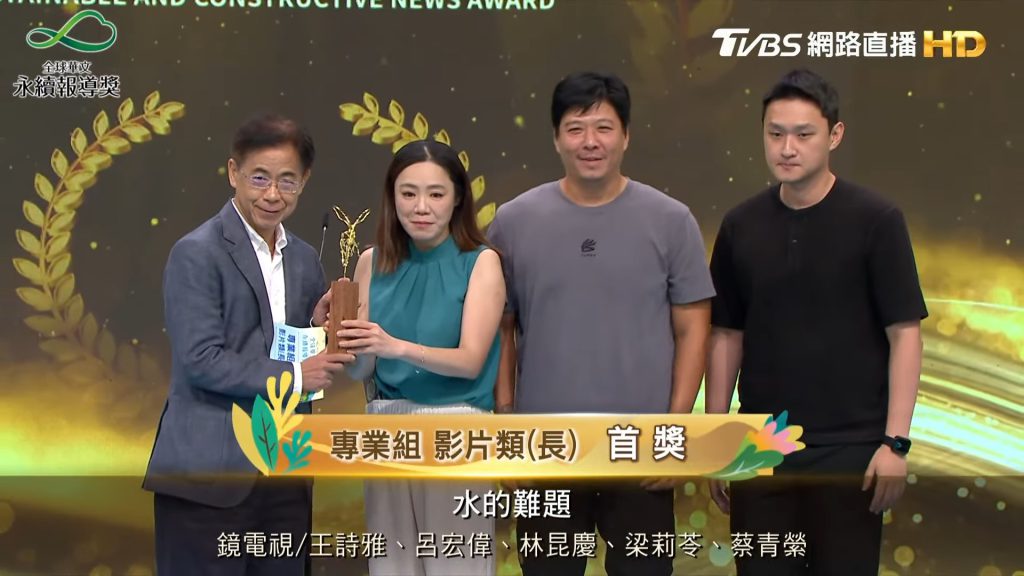 奪下專業組影片(長)首獎的報導,由王詩雅校友與鏡電視團隊製作的《水的難題》。團隊深入揭露台灣工業與醫療廢水治理隱憂,用鏡頭與鍥而不捨的追蹤調查,記者突破重重關卡,直擊許多單位最不願承認的事實。團隊勇於揭露污水治理真相,調查深入、鏡頭真實震撼,讓隱而不顯的社會危機被看見,報導兼具揭露與解方,展現新聞專業高度與公共關懷。