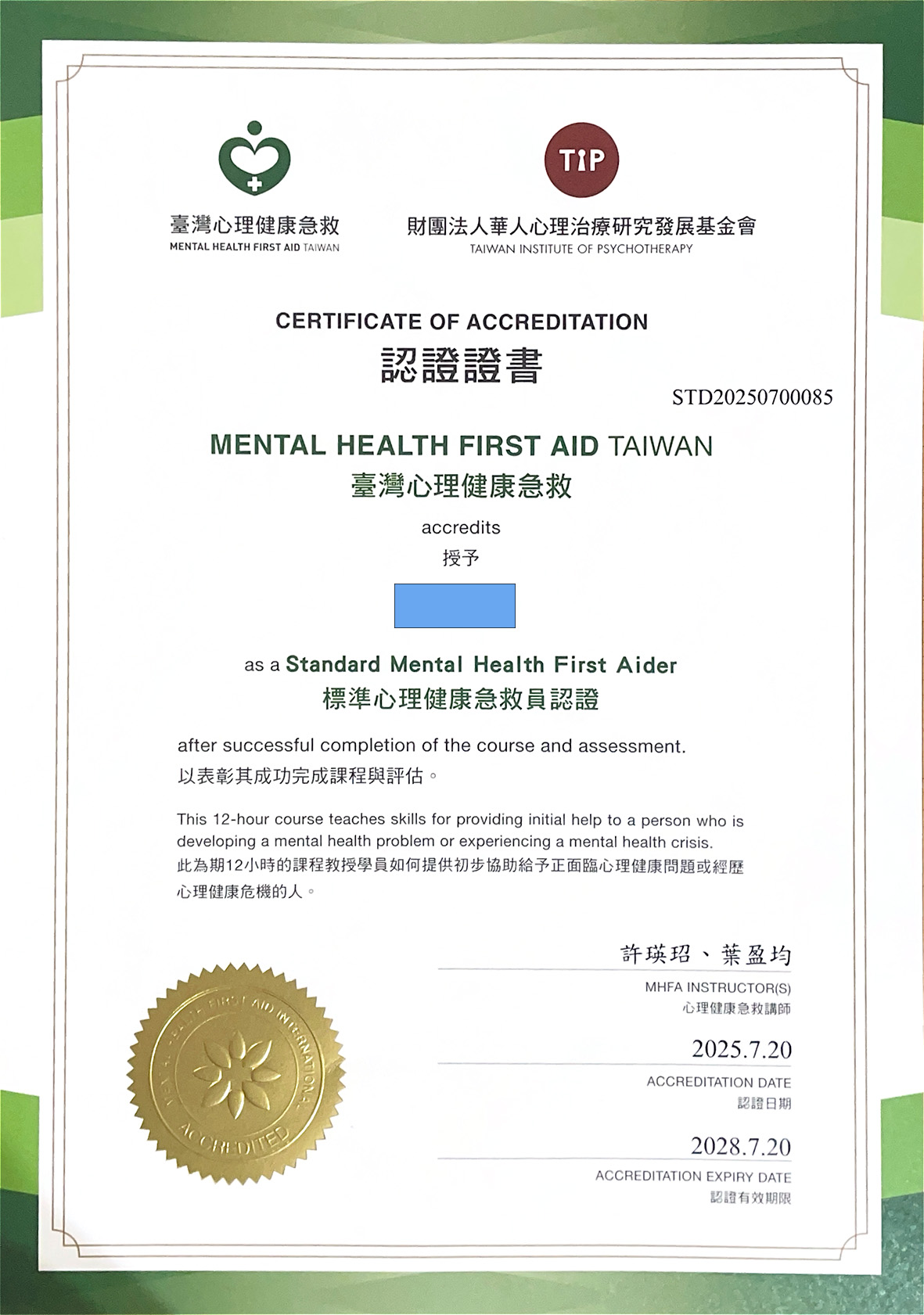 【本刊訊】為強化校園心理健康守門網絡,銘傳大學心理學系積極推動衛生福利部「心理健康急救(Mental Health First Aid, MHFA)」課程。繼今年7月由鄭夙珍等19位師生取得全台首批「心理健康急救員」證書後,12月將再與產學暨推廣處合作開設兩梯次MHFA培訓課程,歡迎師生踴躍報名,一同推動心理健康從身邊開始的友善校園文化。