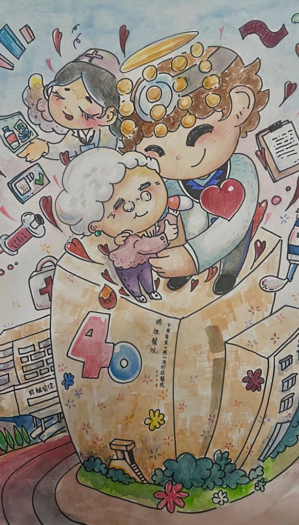 中國醫藥大學北港附設醫院前身為北港朝天宮籌資興建的媽祖醫院,因此在地居民皆俗稱為「北港媽祖醫院」,銘傳商設系學生呂欣恩手繪的《40週年的守護》作品,將醫生化作媽祖婆形象,以溫暖、有愛的態度照顧在地鄉里,展現醫院深耕在地的溫馨一面,獲得評審肯定。
