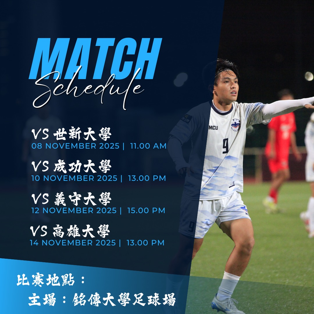 銘傳男足本階段已完成三場賽事,分別以3:0勝世新大學、3:4惜敗成功大學、0:0踢平義守大學。11/14(五)將迎戰高雄大學,邀請師生們前來應援,做為球隊的最佳第12人。