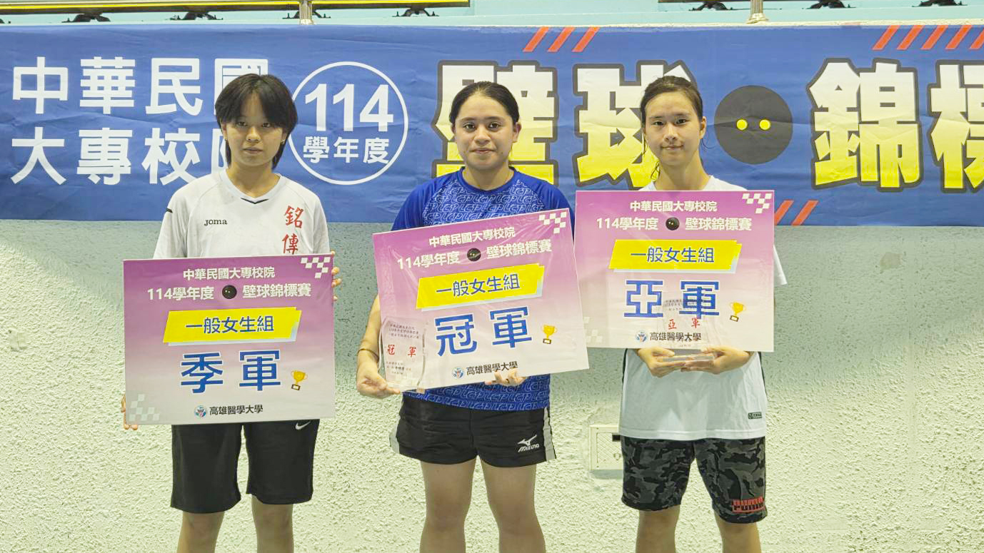 【本刊訊】銘傳大學壁球隊於11/15–16前往高雄市苓雅運動中心,參加「114學年度大專校院壁球錦標賽」,本次賽事傳回好消息:體育室賀中慧老師勇奪教職員女子組金牌;學生組部分,犯罪防治學系黃靖庭獲得一般女子組銀牌,同系黃俐燕則拿下銅牌,表現亮眼。