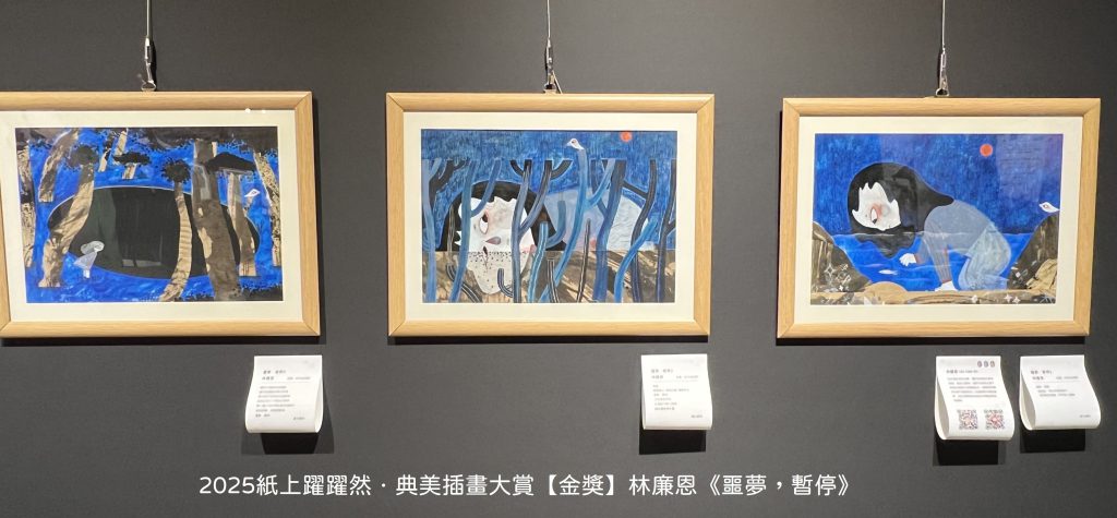 「典美插畫大賞」自2018年起推動辦理,以打造新秀插畫家發揮的舞台為宗旨,成為台灣插畫界爭相競逐的獎項。林廉恩從第一屆就開始參與,曾在2018年獲得優選、2021年獲得銀獎,今年2025年以《噩夢,暫停》榮獲金獎殊榮,運用其擅長的複合媒材與拼貼,展現層次豐富的視覺語彙打動評審。