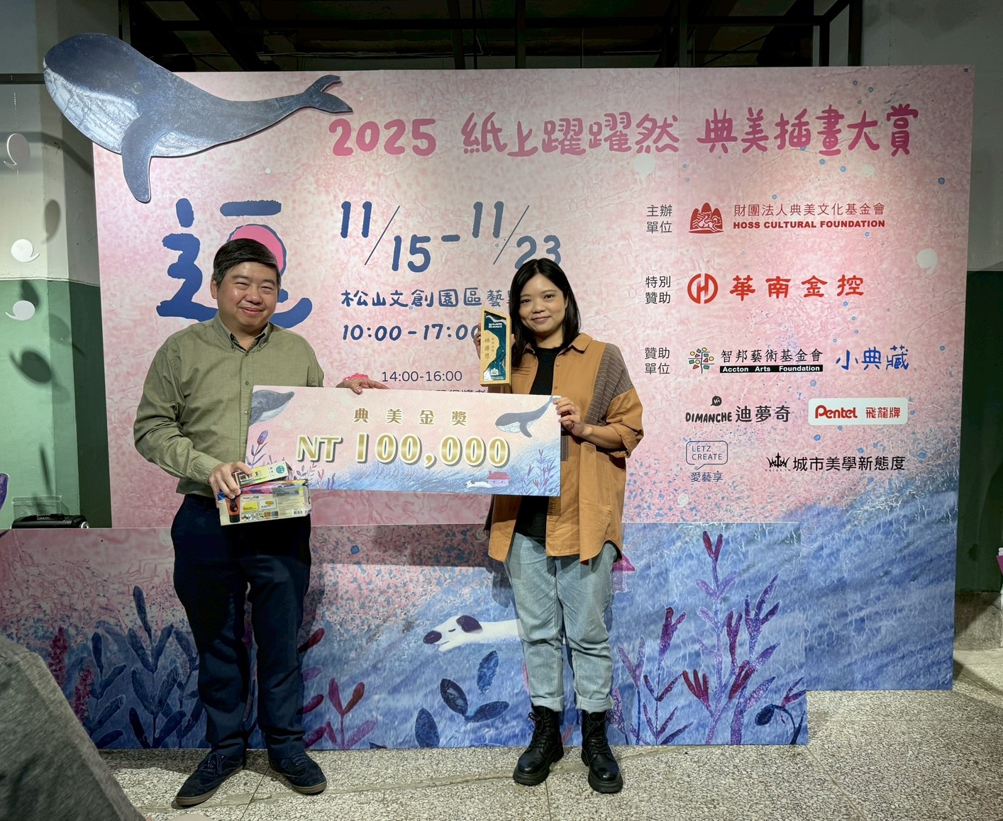 【本刊訊】插畫家林廉恩校友(銘傳商設系2011年畢)參加由財團法人典美文化基金會主辦的「2025典美插畫大賞」以《噩夢,暫停》作品,榮獲金獎殊榮,11/15-23在松山文創園區藝異空間舉行的「2025紙上躍躍然《逗號 插畫創作聯展》」中展出,展覽首日舉行頒獎典禮,由典美文化基金會執行長何堉輝(上圖左,圖/典美文化基金會提供)親自頒獎。