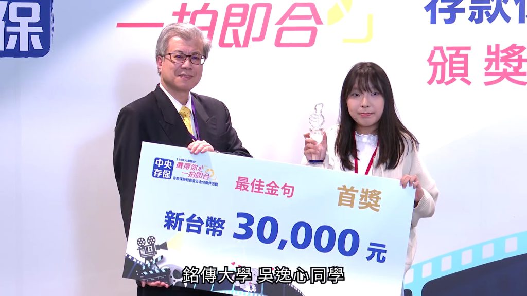 【本刊訊】銘傳大學新媒體暨傳播管理學系參加由中央存款保險公司主辦的「114年大專院校存款保險短影音及金句徵件競賽」,11/21在台北文創6樓舉行頒獎典禮,新傳系三年級生吳逸心從全國近300件創作投稿、來自74所大專校院中,脫穎而出,榮獲最佳金句首獎、獎金3萬元。