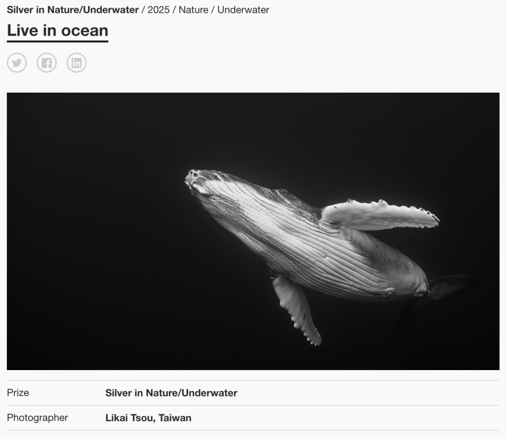 【本刊訊】銘傳會計系 87 級校友鄒立楷,以「飛行鯨魚」系列作品,在2025年法國巴黎PX3(Prix de la Photographie Paris)攝影大賽中榮獲自然類銀牌肯定。飛行鯨魚系列作品為鄒立楷於2023年在東加王國海域所拍攝,完整呈現座頭鯨優雅破水、在海面下展翼般的震撼身姿。
