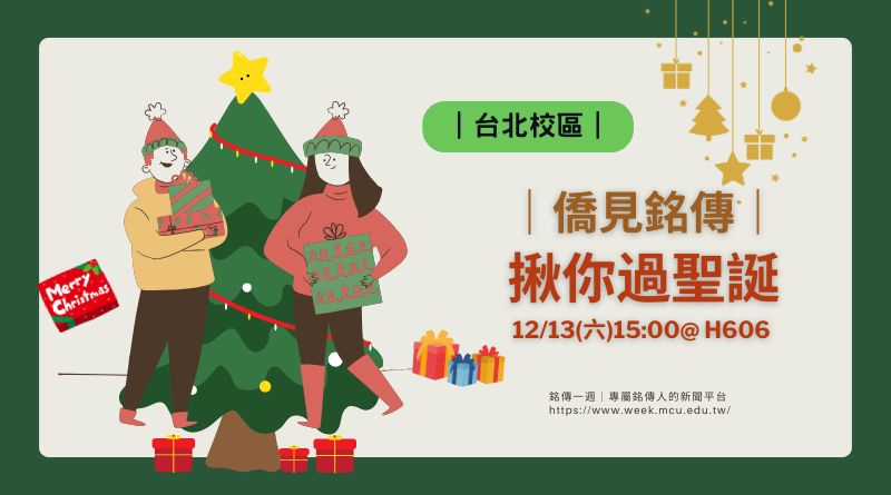 隨著聖誕節腳步靠近,台北校區的節慶氣氛也悄悄升溫。馬來西亞僑生同學會「僑見銘傳」將於 12/13(六)15:00-20:30 在 H606 舉辦年度聖誕活動「揪你過聖誕」,以禮物交換、餐點分享與輕鬆歡聚的方式,陪伴僑生在期末前夕度過一個溫暖的節日午後。
