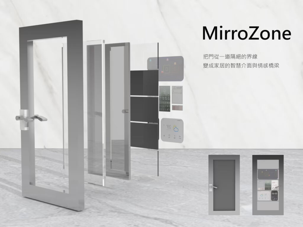 本屆競賽以「創新視界.觸動未來」為題,並聚焦在「顯示玻璃」為創作材料,以探索顯示玻璃材料的應用潛力,打造更智慧、更便利、更具沉浸感的生活體驗,同時兼顧市場可行性與產業應用價值。由銘傳品設系高凱寜老師指導,廖哲宏、沈瑞棋、賀偉樂等3位三年級生組成「讓我康康」隊伍,設計作品《MirrorZone》是一款兼具科技與情感設計的智慧門,不僅是居家出入口,更被定位為家庭的「情感畫布」。