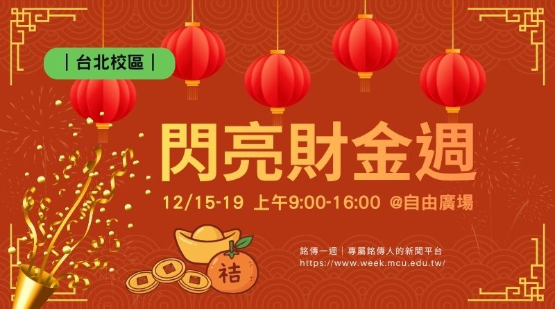 「咚咚隆咚鏘 咚咚隆咚鏘」財金系學會將於 12/15-19每天 9:00–16:00 在自由廣場舉辦財金週,今年主要以「過年」為主題打造年節氣氛濃厚的市集空間,邀請台北校區師生在期末前一起感受溫暖與熱鬧的節慶氛圍。