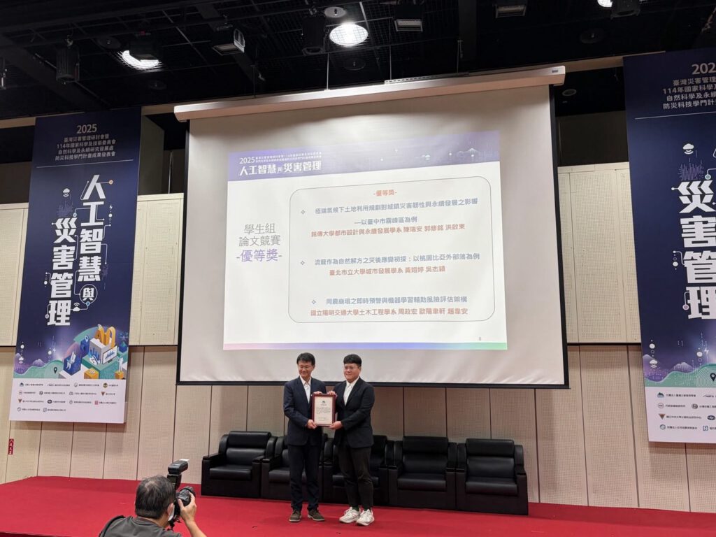 【本刊訊】由社團法人臺灣災害管理學會舉辦的「2025臺灣災害管理研討會」暨「114年國家科學及技術委員會自然科學及永續研究發展處防災科技學門計畫成果發表會」,12/12在新北市大坪林聯合開發大樓15樓舉行,銘傳大學設計學院洪啟東院長獲頒「114年度傑出貢獻獎」,及其指導的銘傳大學都市設計與永續發展學系碩士生陳瑞安、郭修銘,亦榮獲學生組論文競賽優等獎,展現銘傳在災害管理研究領域上的優異表現。