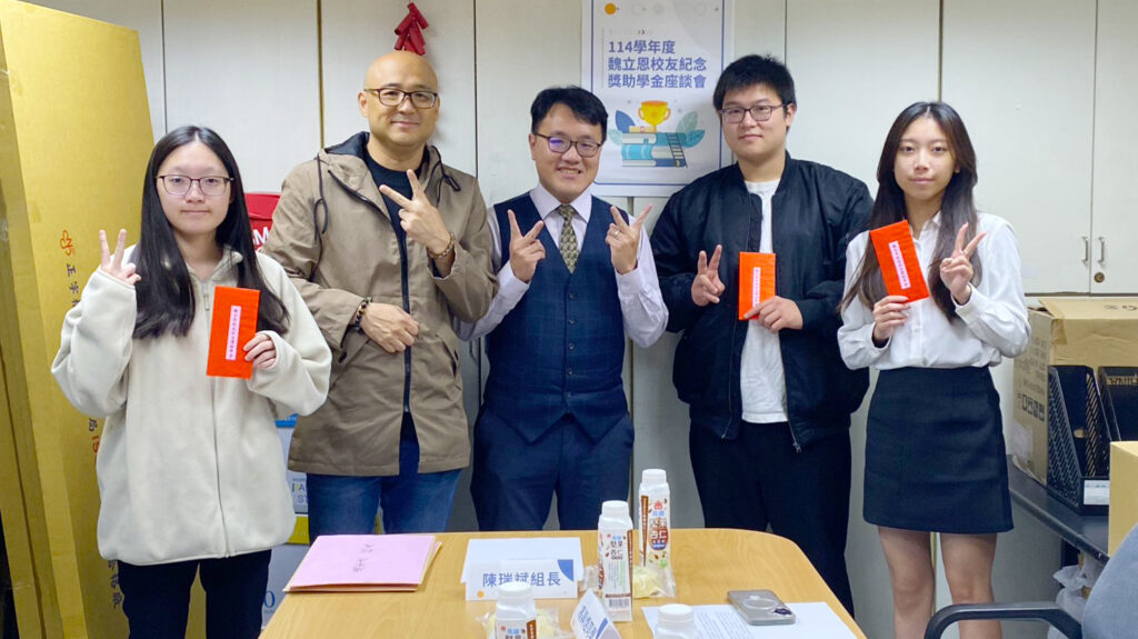 【本刊訊】「魏立恩校友紀念獎助學金」12/12辦理座談會,由獎助學金設立人、企管系畢業校友盧家彥及財金系畢業校友林宥成,親自頒發獎助金予本學年度獲獎學生,包括財金系陳柔錚(系學會會長)、企管系黃靖雅(創新創業社社長)及財金系馮興煜(系學會副會長),並於會後與學弟妹交流互動,分享經營學生社團的歷程與體會。