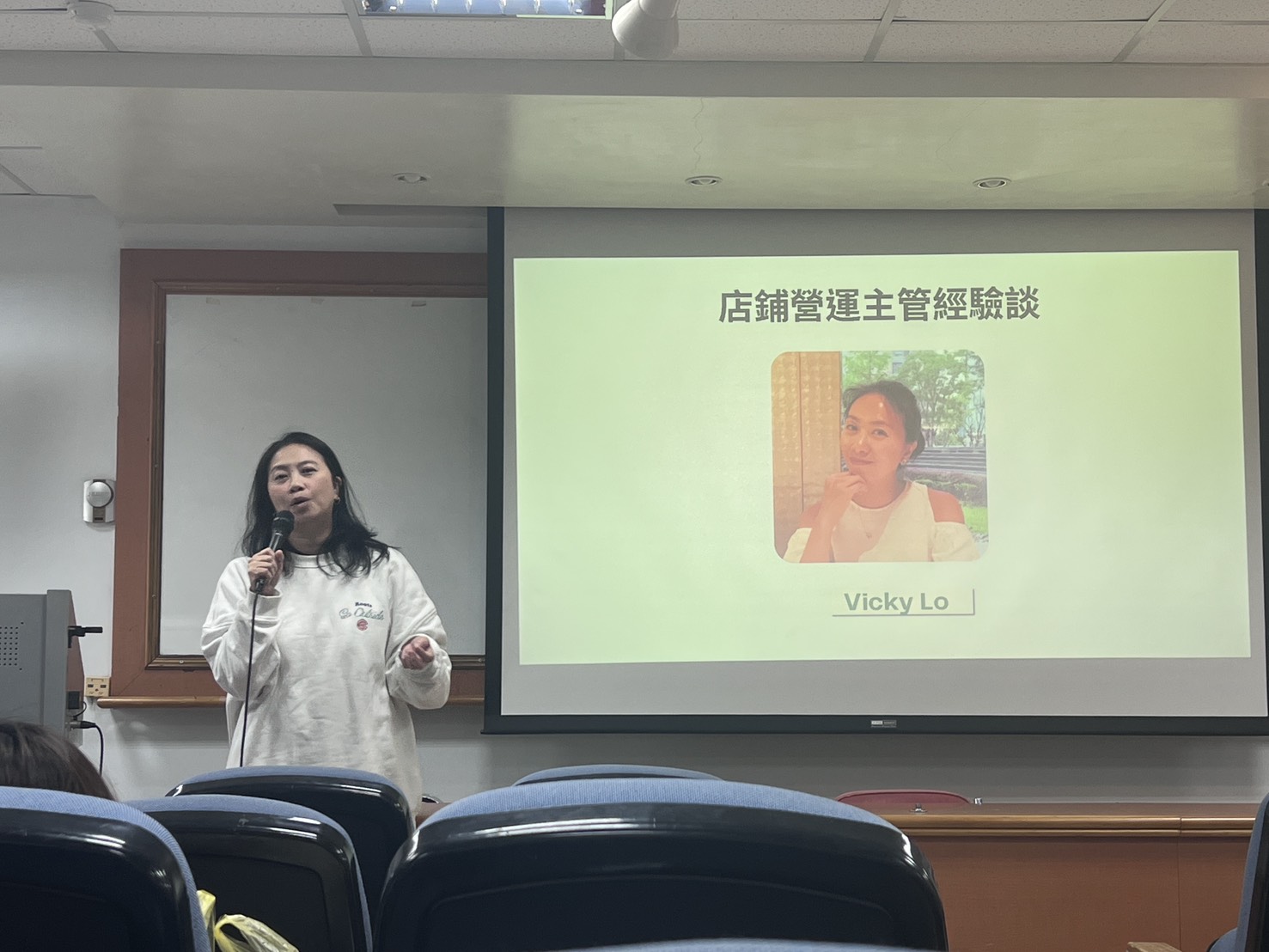 He described his experience of taking and passing the managerial skills assessment, which later opened doors to career advancement. The representative concluded by presenting several brand locations that are currently recruiting interns and staff, offering students clear pathways to apply what they have learned.