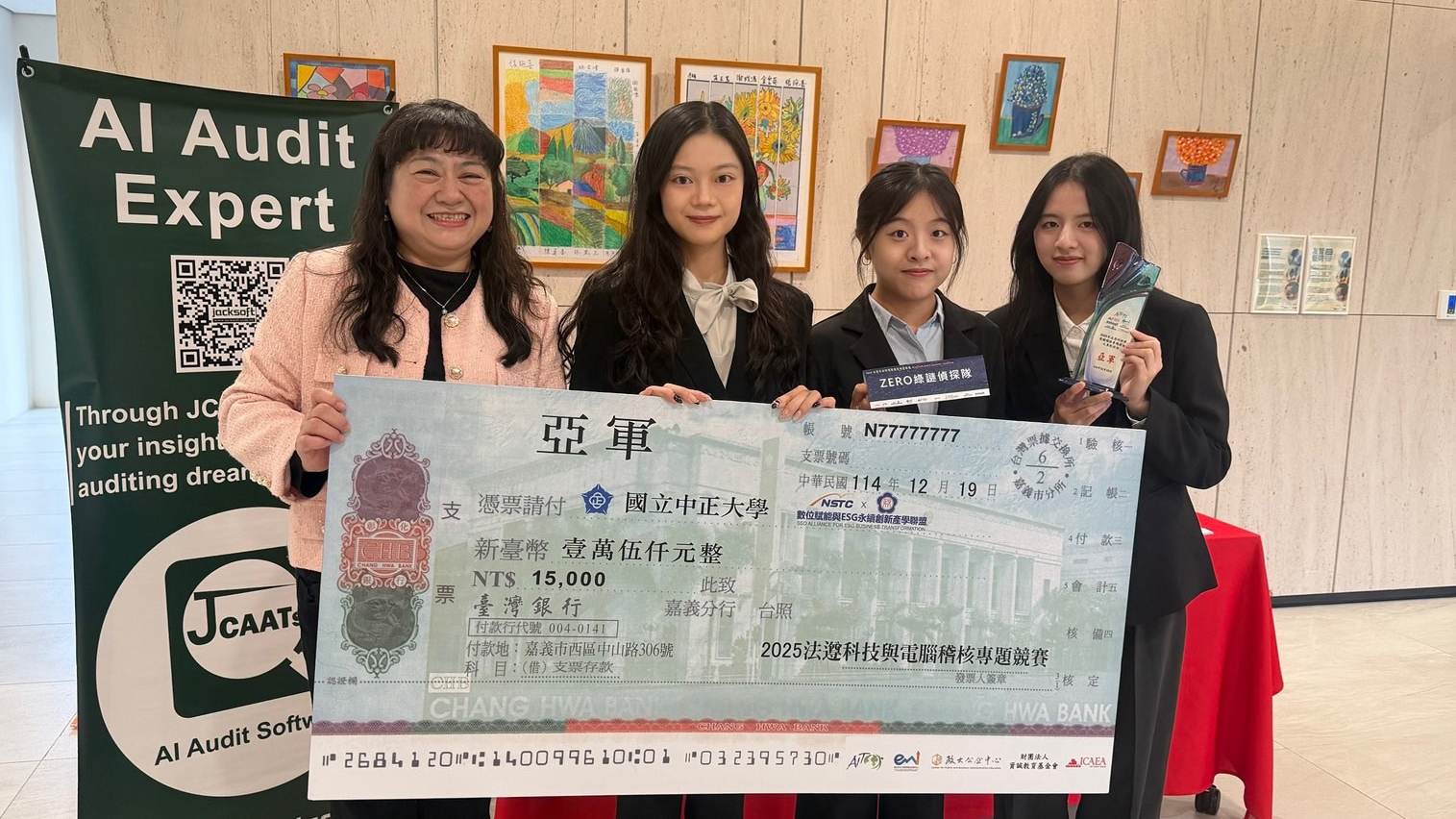 榮獲全國亞軍殊榮的「ZERO綠謎偵探隊」由會計系楊志豪主任指導,林宓萱、王芷蕾、陳雨琪組隊參賽。團隊以「ZERO漏洞偵查:揭露舞弊風險與永續資訊控管查核專案」為題,結合會計審計專業與AI查核技術,切入企業永續報告書與反漂綠查核議題,提出具體可行的評分架構,深獲評審肯定,成為全國前三名中,唯一入榜的私立大學會計系。