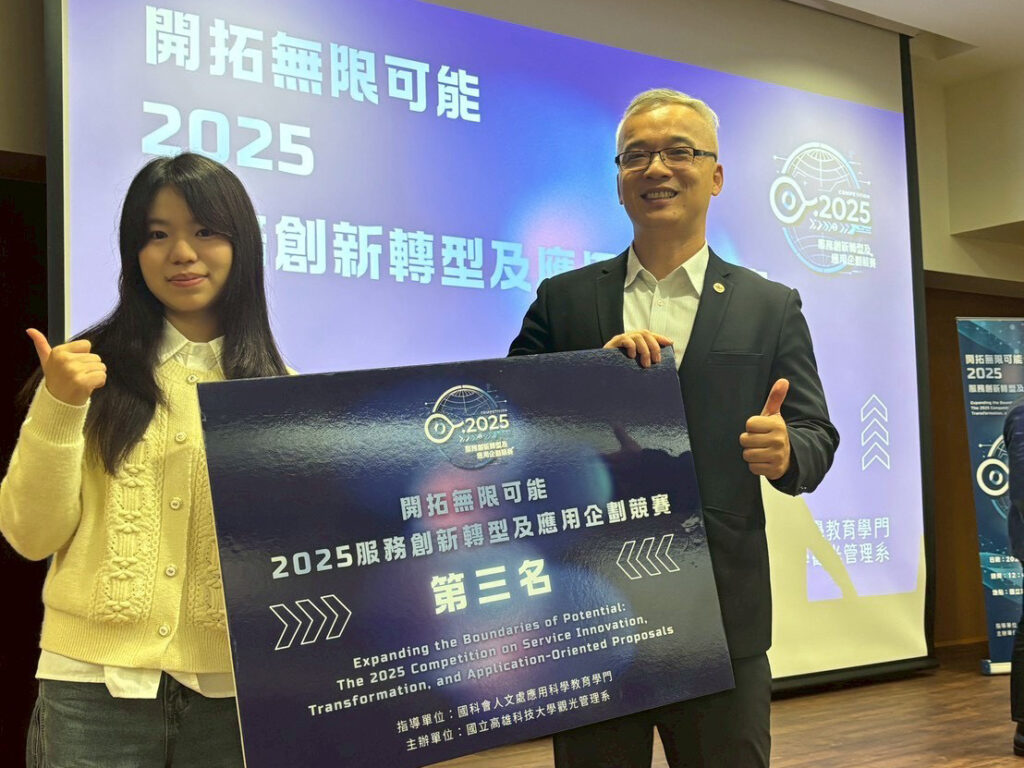 【本刊訊】銘傳大學餐旅管理學系參加由國科會人文處應用科學教育學門指導的「2025服務創新轉型及應用競賽」,12/19在國立高雄科技大學燕巢校區瑛苑廳舉行決賽,由周勝方老師指導的2組微型創業團隊,以生成式AI技術導入傳統餐旅模式,設計出卓越的企劃提案,從眾多好手中脫穎而出,奪得第三名、優勝,展現銘傳學生在生成式AI應用與餐旅創新實務上的傑出實力。