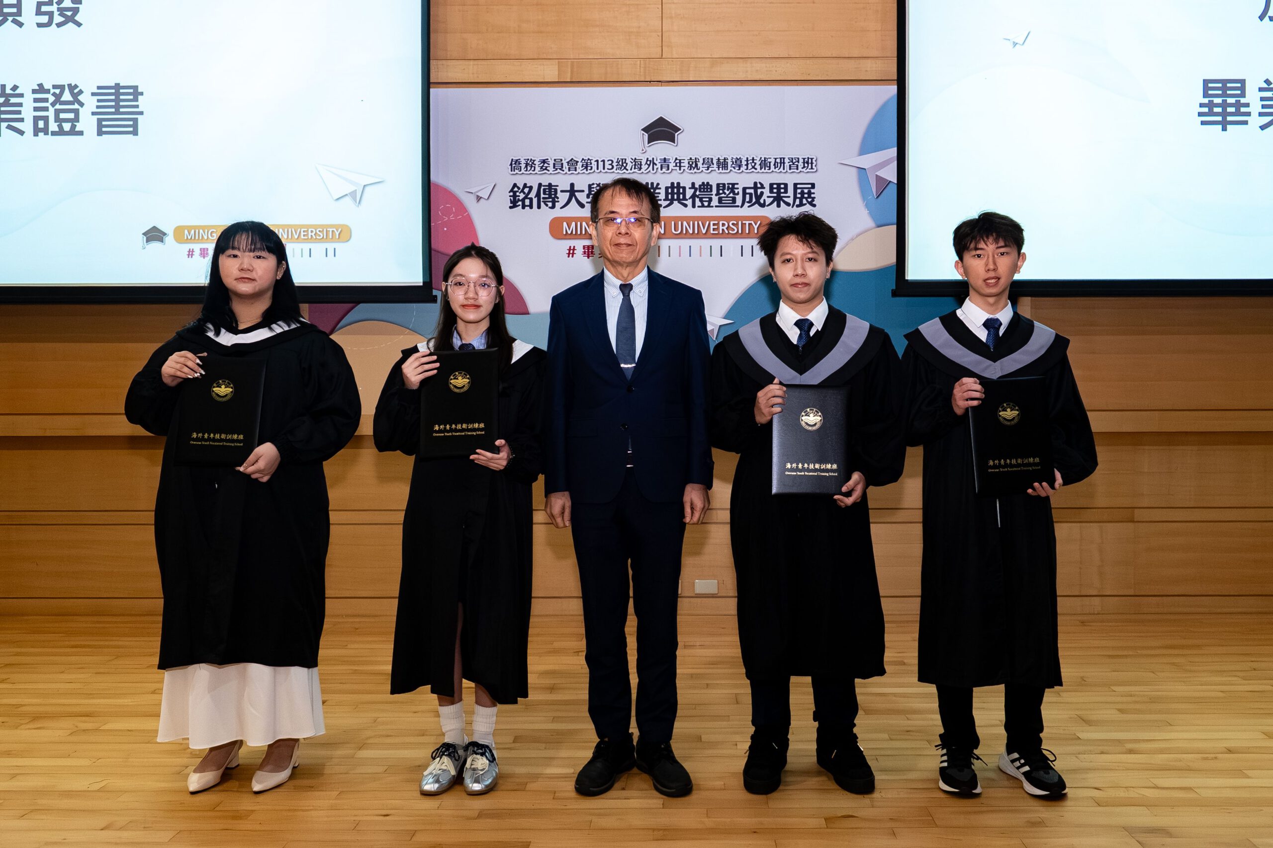 【本刊訊】僑務委員會第113級海外青年就學輔導技術研習班銘傳大學畢業典禮暨成果展12/18在桃園校區FFB101國際會議廳圓滿舉行,由李銓總校長、李選士校長親臨主持,今年銘傳海青台北大眾傳播科18位、桃園數位媒體設計科25位,共43位畢業生順利完成兩年學業,與各科授課教師、畢業生、親友、學弟妹相聚一堂共享畢業的喜悅。
