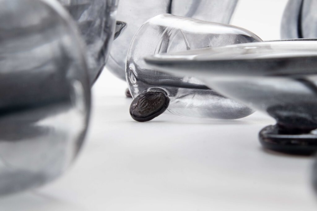 本次展覽核心作品「黑玉」系列,源自陳建志對黑色玻璃材質的長期研究。古代黑色玻璃受限於材料成分,多帶有紫色調,需藉由增加厚度才能維持色澤;而在當代玻璃技術的支持下,已能精準調配出純粹的正黑色,即使採用輕薄的吹製工法,仍能呈現飽滿、穩定且不偏色的質地,展現工藝技術的顯著進化。