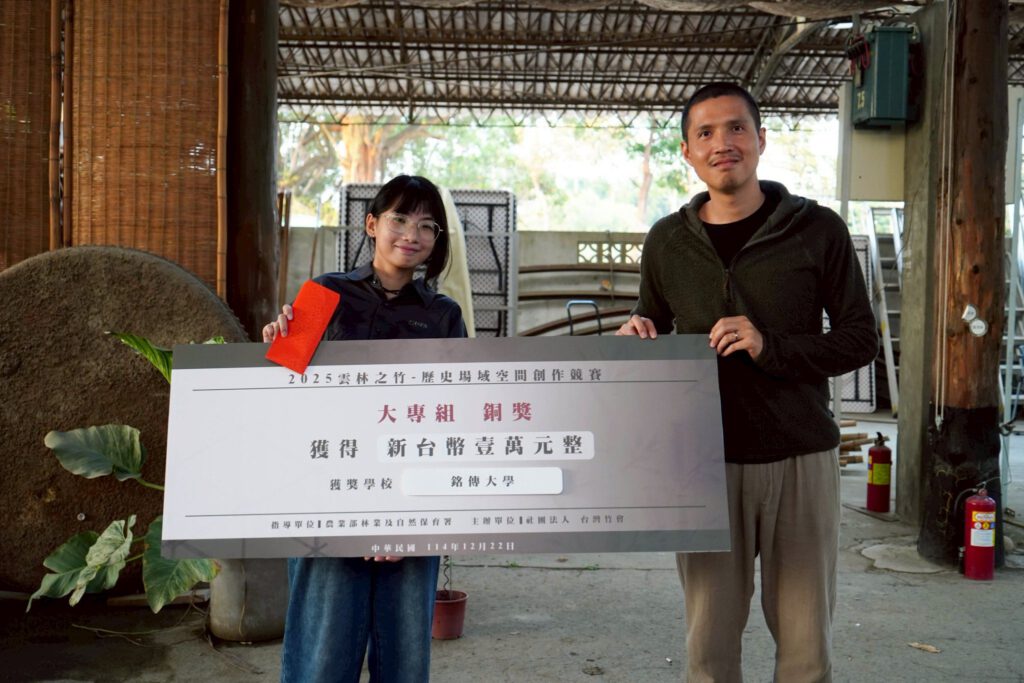 【本刊訊】為推動國產竹材多元應用、深化青年世代對永續建築與在地文化的理解與實踐,由農業部林業及自然保育署攜手社團法人台灣竹會主辦的「2025雲林之竹-歷史場域空間創作競賽」,2025/12/22在雲林斗六糖廠歷史場域舉行競賽成果發表暨評審活動,銘傳大學建築學系學生團隊以歷史遺構與自然環境之關係為創作核心,實地搭建的竹構築作品《兩端未定》榮獲大專組銅獎。