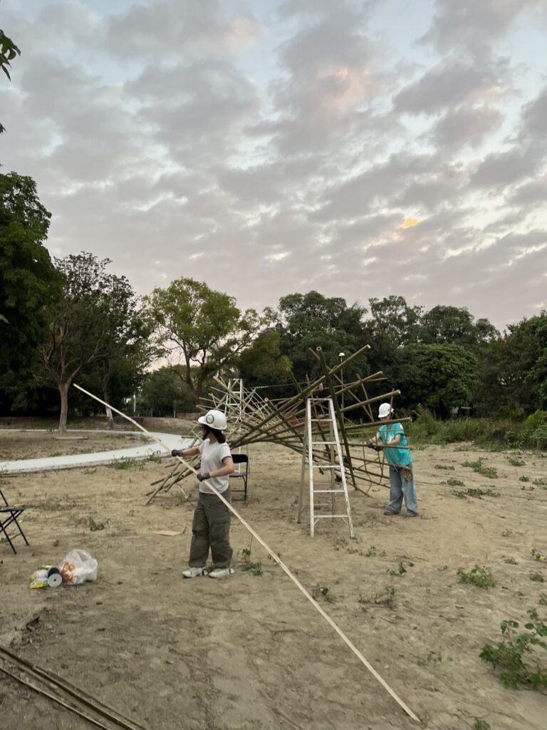 在實際執行過程中,團隊從材料採購、預算控管到構造組裝,面臨將設計圖轉化為實體構築的多重考驗。受限於經費與施工條件,團隊不得不大幅修改原始設計,並在緊湊的時程內投入高強度施作,最終成功完成作品,讓竹構築完整融入歷史場域,展現從概念到實踐的學習成果。