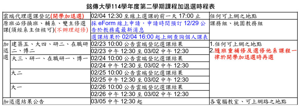 【本刊訊】迎接金馬賀新春,銘傳大學114學年度第2學期開學日在2/24,網路選課「加退選」,自2/4中午12:30起搶先開放「雲端代理選課登記」,同學可以上網「預先登記選課」,將想加選的課程,在「正式加退選」前一天下午17:00前,完成雲端代理選課登記,將由電腦系統依照志願序為同學進行選課。