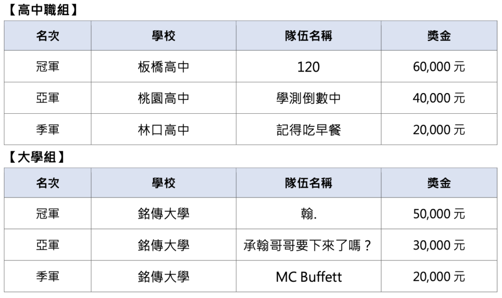 競賽不僅祭出總獎金新臺幣22萬元,並邀請業界重量級專家擔任評審,為賽事專業度再添分量。銘傳大學金融科技學院院長李進生於決賽後表示,「透過這次競賽,我們看見許多年輕世代在ETF投資上的專業潛力。未來金融市場的關鍵操盤手,很可能正從校園中誕生。」