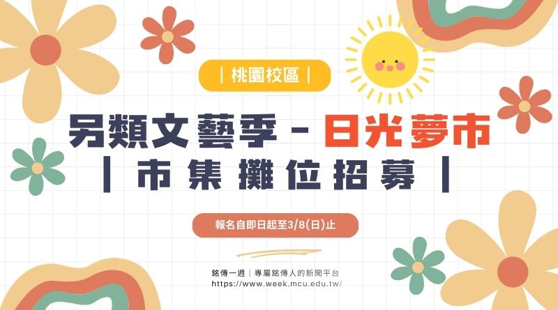 銘傳大學桃園校區第25屆學生會推出「114(下)另類文藝季-日光夢市」市集攤位招募,即日起開放校內同學報名參與,邀請具創意與文創設計能量的學生進駐市集,共同形塑春季校園的藝文風景。活動由學生會主辦,學務處課外活動指導組與桃園行政處學務組指導,期盼透過市集平台促進校內創作交流,展現銘傳多元而溫暖的文化氛圍。