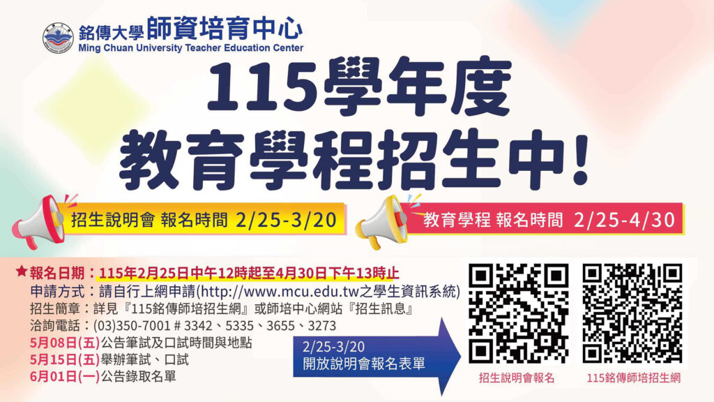 【本刊訊】為培育優質中等學校師資、回應跨領域教學與專業人才需求,銘傳大學師資培育中心115學年度「中等學校師資類科教育學程」正式啟動招生,本學年度除原有16個類科外,更新增生物、建築、室內設計等3項專長,歡迎對教育懷抱熱忱的同學踴躍報名,踏上成為合格中學教師的專業之路。師培中心安排有多場次說明會,說明會即日起報名至3/20止,報名表單:https://forms.gle/ib6MwwReNjLNPVWR6。