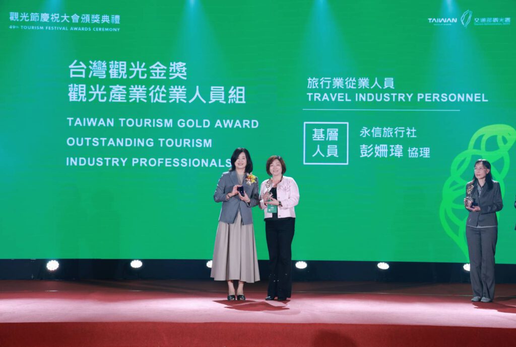 永信旅行社協理彭姍瑋獲頒旅行業從業人員「基層人員組」榮耀。彭姍瑋在觀光產業致力奮鬥,期望打造「品質、品牌、品味」兼具的品牌優勢,此次憑藉深厚的實務專業與服務熱忱獲得肯定,在顧客應對與團隊整合上展現高度專業與前瞻視野,帶領團隊穩健前行,也為公司注入源源不絕的成長動能與活力。這不僅是個人職涯的巔峰榮耀,更展現了銘傳觀光校友在業界深耕、具備領航者地位的硬實力。