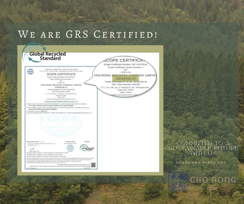 通過GRS認證,肯定了卓蓉在永續發展和環保方面的承諾。透過GRS認證,我們確保產品中回收材料的成分、供應鏈追溯以及符合嚴格的環境和社會要求。她進一步強調,感謝所有團隊成員的努力與奉獻,讓這一切成為可能。未來,我們將持續為地球盡一份心力,為客戶提供更環保、更值得信賴的制服產品。