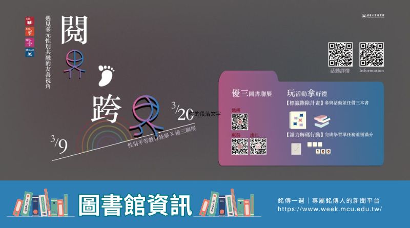 閱讀開啟視野,理解促進共融。銘傳大學圖書館將於3/9(一)至3/20(五)在台北校區圖書館、桃園校區圖書館及金門圖書室舉辦「【閱界・跨界】遇見多元性別共融的友善視角」性別平等教育特展。活動以閱讀與互動體驗為核心,透過「優三圖書聯展」、「標籤撕除計畫」互動牆與「讀力解碼行動」三大主題活動,引導師生從日常生活出發,理解多元性別議題,培養更具同理與尊重的視角。