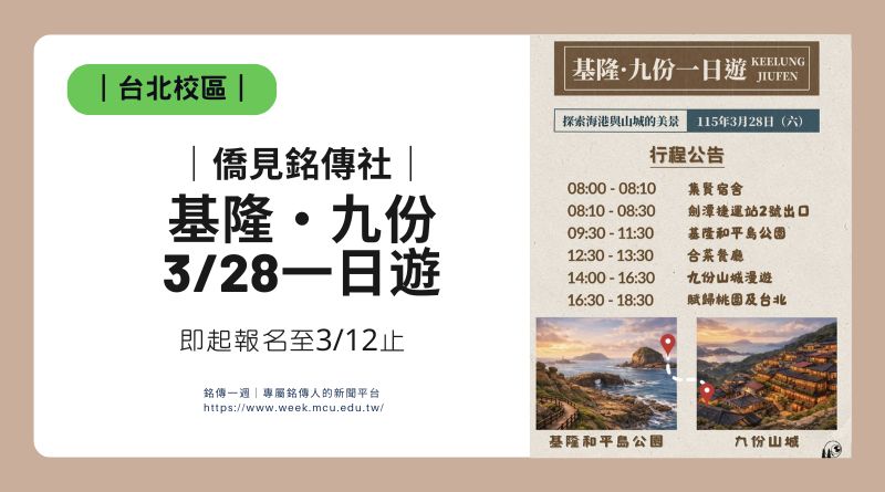 僑見銘傳表示,此次一日遊希望讓學生在繁忙課業之餘走出校園,透過旅行認識台灣北海岸與山城文化。誠摯邀請有興趣的學生把握機會報名參加,在海風與山景之間展開一段放鬆身心的小旅行。報名連結: