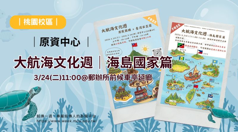 在海風與文化交織的想像中,海島國家蘊藏著多元而鮮明的生活風貌。銘傳大學桃園校區原住民族學生資源中心將舉辦「大航海文化週|海島國家篇」,透過互動遊戲與文化體驗活動,帶領學生走入不同海島國家的飲食與文化日常。活動將於3/24(二)11:00-14:00在郵辦所前候車亭延廊舉行多國互動遊戲攤位,並於3/24(二)至3/26(四)在原住民族學生資源中心辦理DIY手作體驗,邀請全校師生一同感受多元文化的魅力。