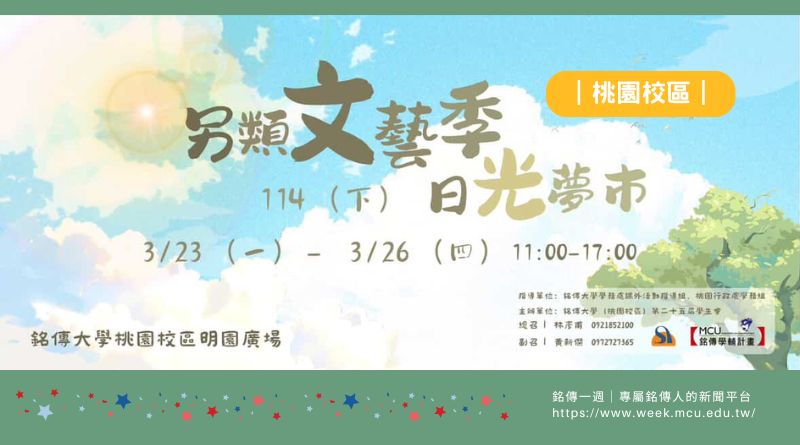 春日暖陽灑落校園,正是讓創意與靈感發芽的季節。銘傳大學桃園校區學生會將於3/23(一)至3/26(四)11:00-17:00在明園廣場及體育一館沿廊舉辦「另類文藝季-日光夢市」,以夢想市集為主題,結合藝術創作、生活風格與青春想像,打造充滿文藝氣息的校園場域,邀請師生在陽光與創意交織中,展開一場輕鬆療癒的市集漫遊。
