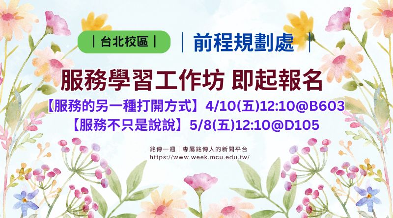 為提升學生對「服務」的了解,職涯發展中心規劃兩場次的服務學習工作坊,分別為4/10(五)的「服務的另一種打開方式」,以及5/8(五)的「服務不只是說說」,結合心理、永續議題、循環展覽及手作觀察,看見服務不同的連結。