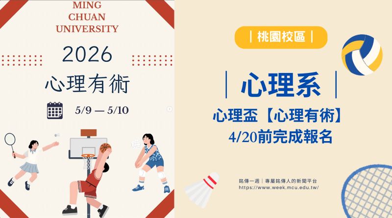 期中考後,讓身體動起來、把壓力釋放出去。心理系年度運動盛事「心理盃-心理有術」即將登場,由心理系學會主辦,將於5/9(六)與5/10(日)在桃園校區體育一館舉行。本次賽事涵蓋籃球、羽球及混合排球三大項目,無論是想認真競技、切磋球技,或是單純活動筋骨、與同學交流,都能在心理盃中找到參與的樂趣。