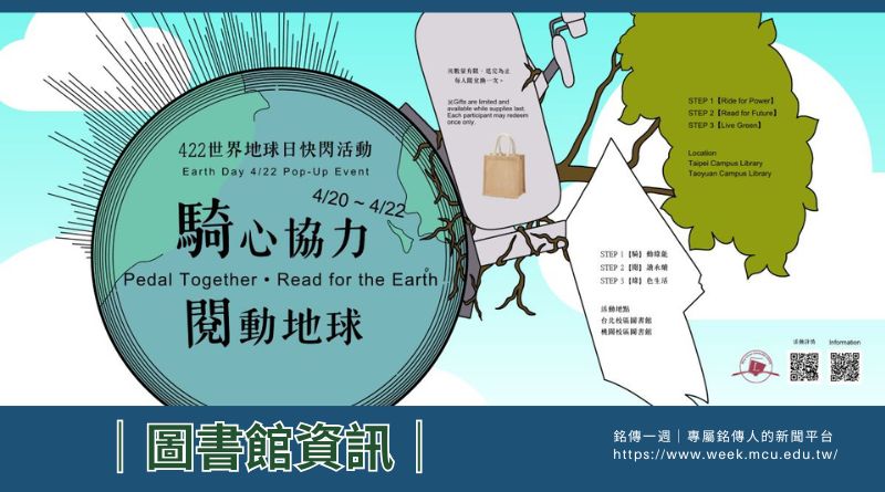 隨著4月22日世界地球日到來,環保議題再次成為關注焦點。圖書館於4/20-22在台北與桃園校區同步推出快閃活動「騎心協力・閱動地球」,結合運動、閱讀與永續行動,邀請全校師生在日常中實踐環保理念,透過身體力行為地球盡一份心力。