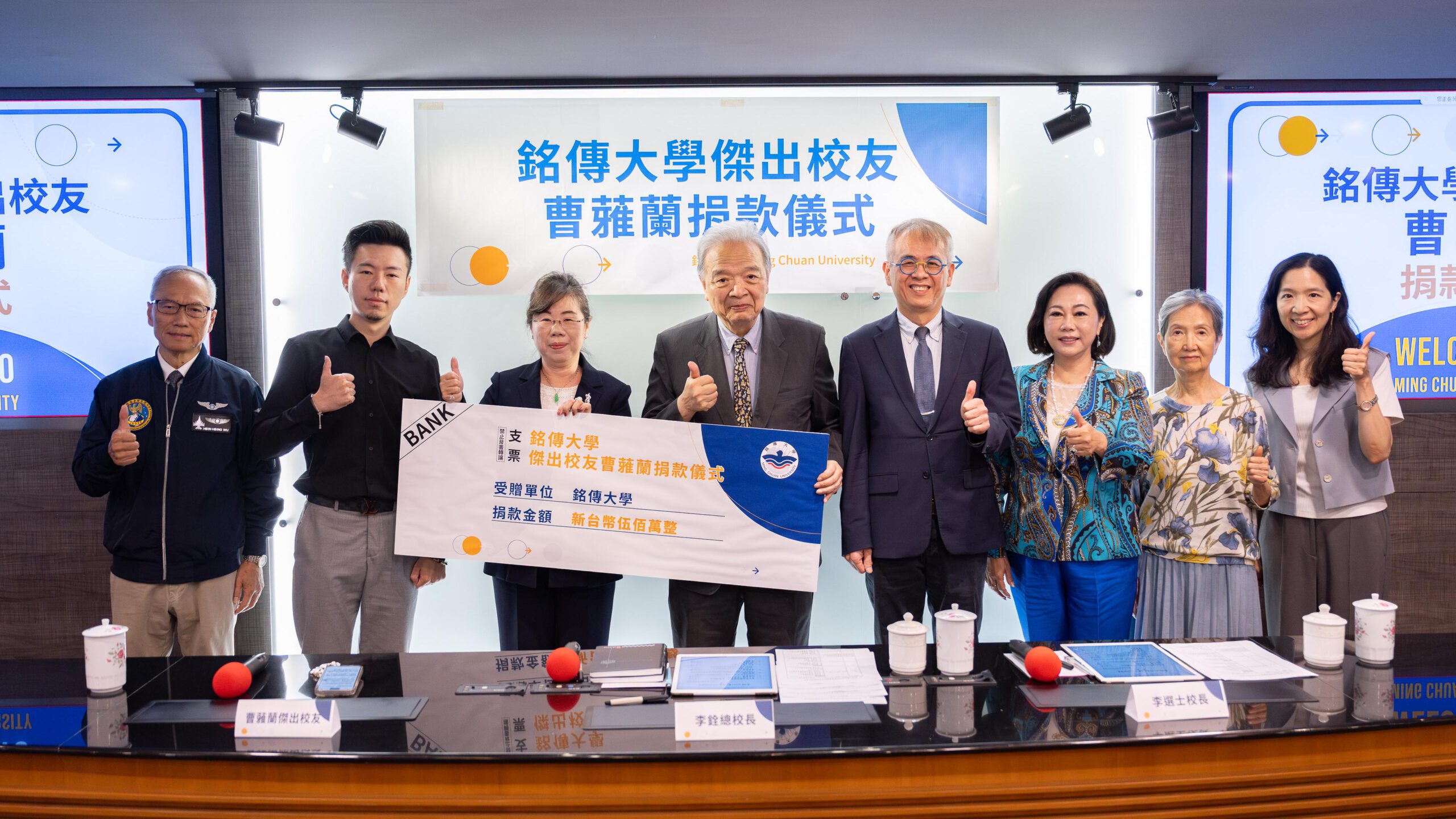 本次捐贈儀式由銘傳大學李銓總校長及李選士校長共同主持,全校一級行政與學術單位主管約百餘人到場觀禮,見證校友回饋母校的溫馨時刻。世界華人工商婦女企管協會總會長林淑敏、副總會長鄭玉廷,以及曹蕥蘭校友公子鄧兆廷特助等亦蒞臨現場,場面隆重而溫馨。