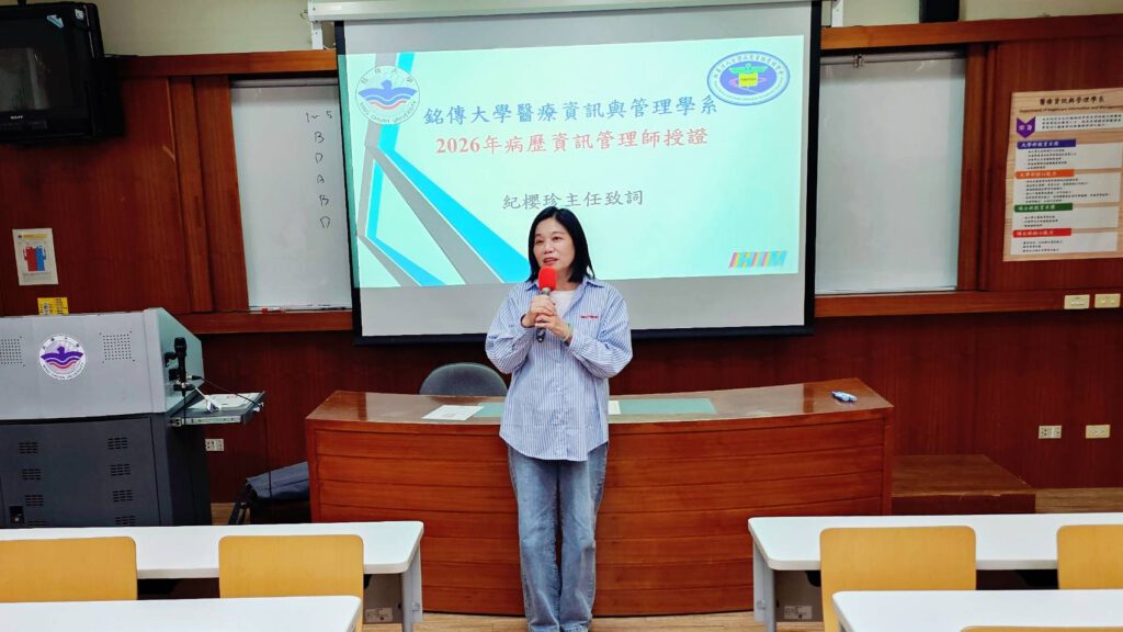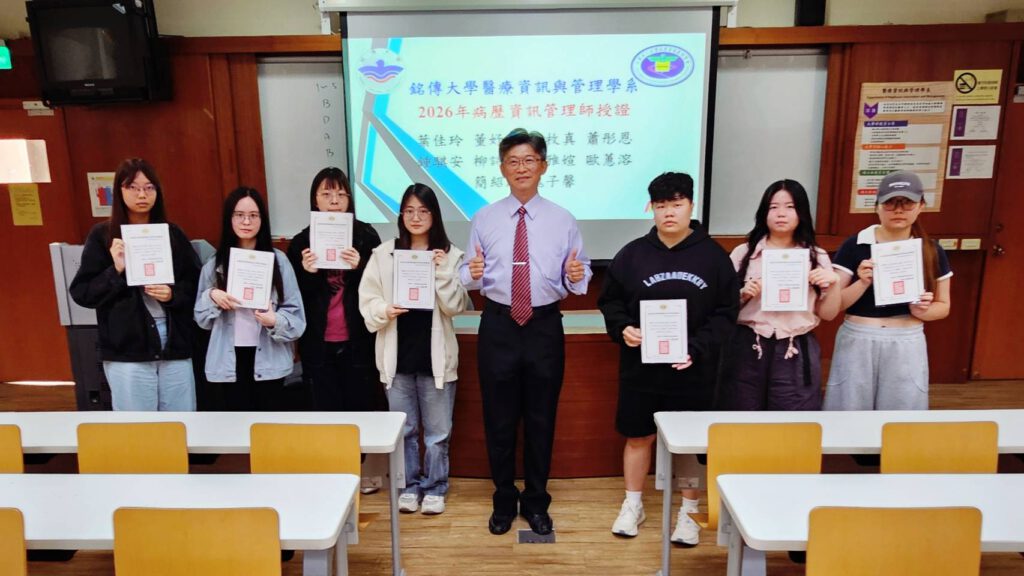 【本刊訊】隨著醫療資訊化快速發展,病歷資訊管理專業人才需求持續攀升。銘傳大學醫療資訊與管理學系114學年度第一學期選修「病歷資訊管理」課程的28名學生,3/21參加由台灣病歷資訊管理學會主辦之「病歷資訊管理師」檢定考試,全數順利通過,展現紮實教學成效與優異學習成果。,4/17中午在AA701教室舉行授證儀式,由系主任紀櫻珍、林政彥老師親自頒發證書表揚。