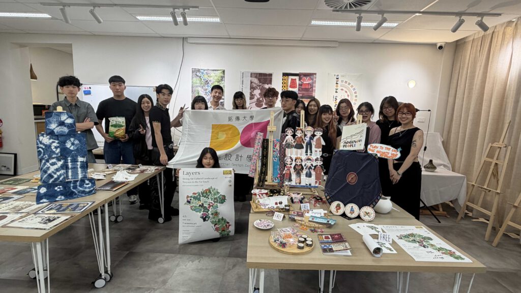 本次移地教學以「創意實作導向」為核心,結合講座、工作坊與策展實務,讓學生在真實情境中累積創作經驗。團隊4/5在當地藝廊7 Seasons Arts舉辦一場「Layers – Seeing the Cultural Landscape of Taoyuan in the Far South」策展,呈現來自桃園多元文化的原住民、客家特色等作品,嘗試以國際語彙轉譯在地故事,強化視覺敘事與跨文化溝通能力。透過與國際設計教育資源接軌,不僅深化學生對永續與文化設計的理解,也為未來就業與升學奠定基礎,同時提升銘傳設計教育的國際能見度與合作網絡。