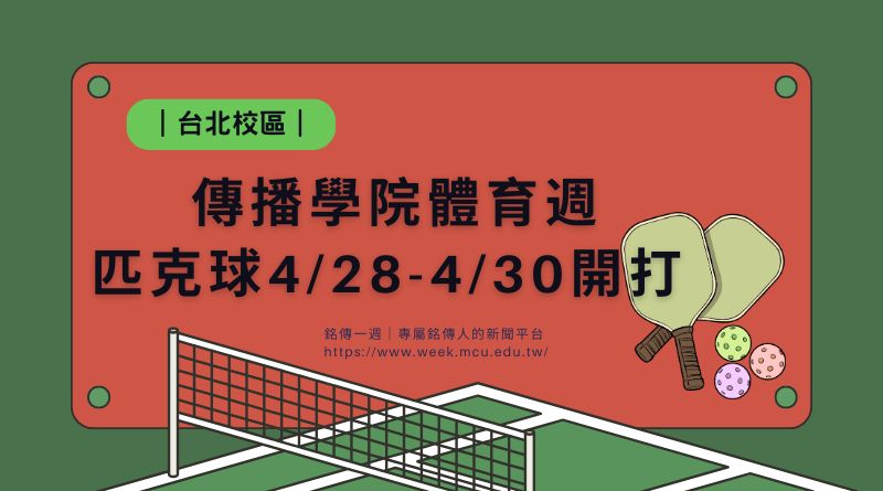 結合網球、羽球與桌球特色的匹克球,近年在校園中迅速竄紅,節奏明快、規則易上手,成為許多同學運動紓壓的新選擇。銘傳大學台北校區傳播學院體育週即將登場,特別規劃匹克球競賽,於4/28(一)至4/30(三)每日中午12:00在網球場開打,邀請傳院同學走出教室,在球場上揮灑汗水、感受運動樂趣。