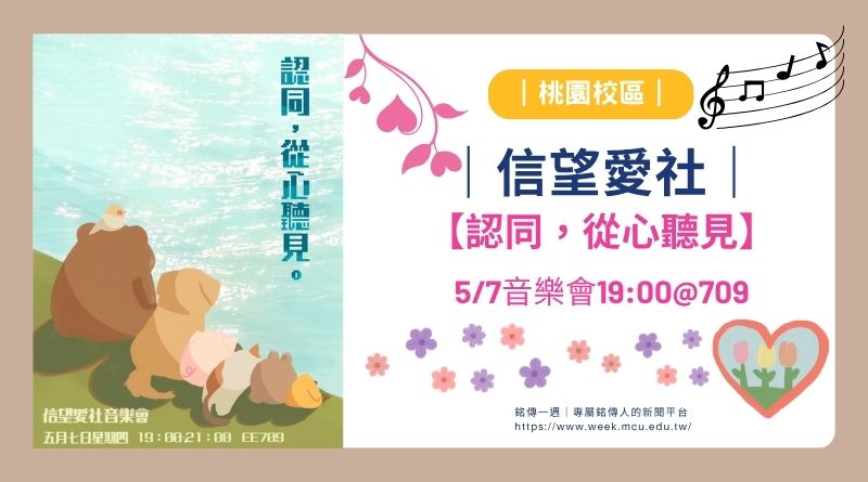 在人生的節奏中,偶爾會被外界期待與現實壓力推著前進,而忽略了內心真正的聲音;當旋律響起,也許正是重新認識自我的契機。桃園校區信望愛社將舉辦「認同,從心聽見」音樂會,於5/7(四)18:30入場、19:00–21:00在EE709教室登場,透過音樂與故事,引領同學在聲音之中找回最真實的自己。